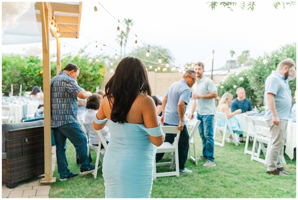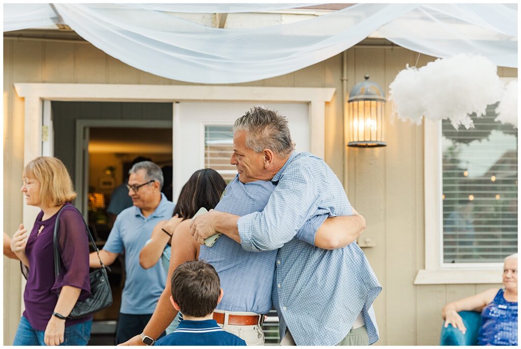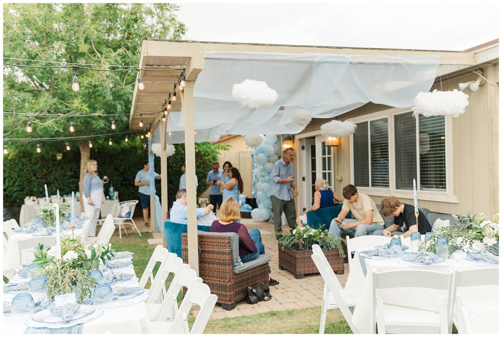 I was amazed when I arrived and saw how perfectly everything was set up in the backyard. It rained a little in the morning, then cleared up all day … and STAYED clear for their entire party, although we could see the giant rain clouds moving closer!! It was so beautiful (and cool out!) Just up until the very end when it started to drizzle … and Nancy shouted “Well, it’s a shower people, you’re going to get a little wet!”